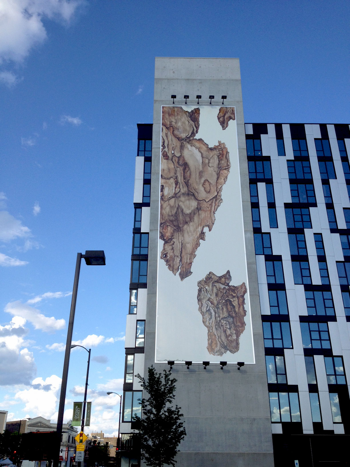 In 2014, Intelligentsia Coffee commissioned me to create an artwork for a building designed by Wheeler Kearns Architects that housed one of the company’s stores. The piece provided a counterpoint to this busy intersection in the heart of Chicago's West Town neighborhood. The 92' X 27' digital print was adapted from a watercolor painting of bark shards.